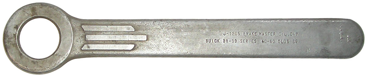Using this special wrench prevents damage to the finely serrated head of the brake main cylinder nut, and makes an easy job of removing, replacing and properly tightening the nut. The serrated head of the hydraulic brake main cylinder nut is easily tightened and loosened with this wrench. The fine serrations in the wrench fit the head exactly, permitting the nut to be turned without damage. Weight 2 lbs.