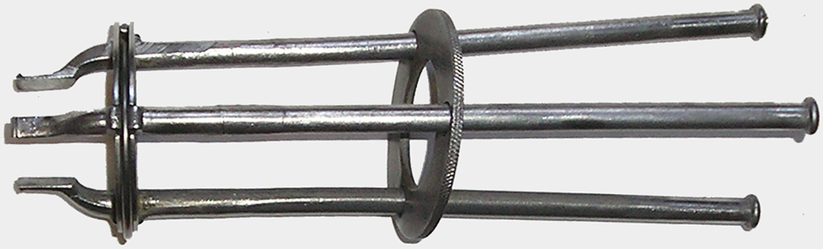 To disassemble the transmission, it is necessary to remove the synchronizing spring and the second speed thrust washer lock ring, and then replace them when reassembling the transmission. The fingers of the tool are formed from chrome steel, and machined very thin at one end to fit under the spring and washer. The fingers extend with a slight outward bend so that when the sliding ring is pulled toward the end of the fingers, the fingers will rock upward at the holder ring (near the thin portion of the fingers), causing the synchronizing spring and lock ring to expand and open enough to be removed or replaced with ease. Weight 1 1/4 lb.